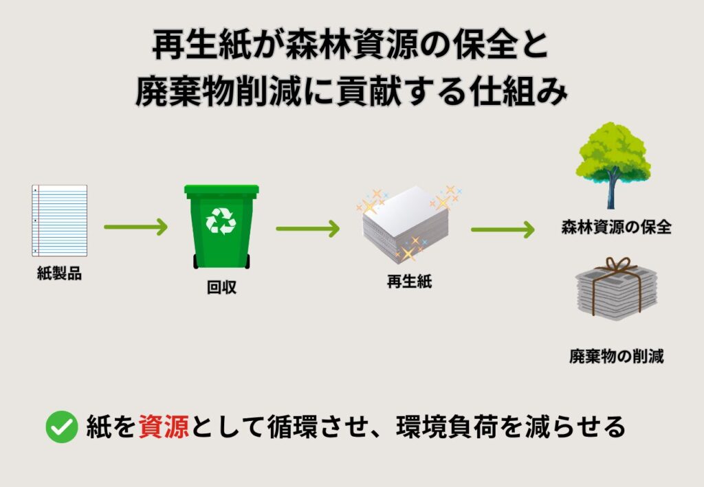 このように、再生紙は「資源の入り口(伐採)」と「出口(廃棄)」の両面で環境負荷を低減する素材です。