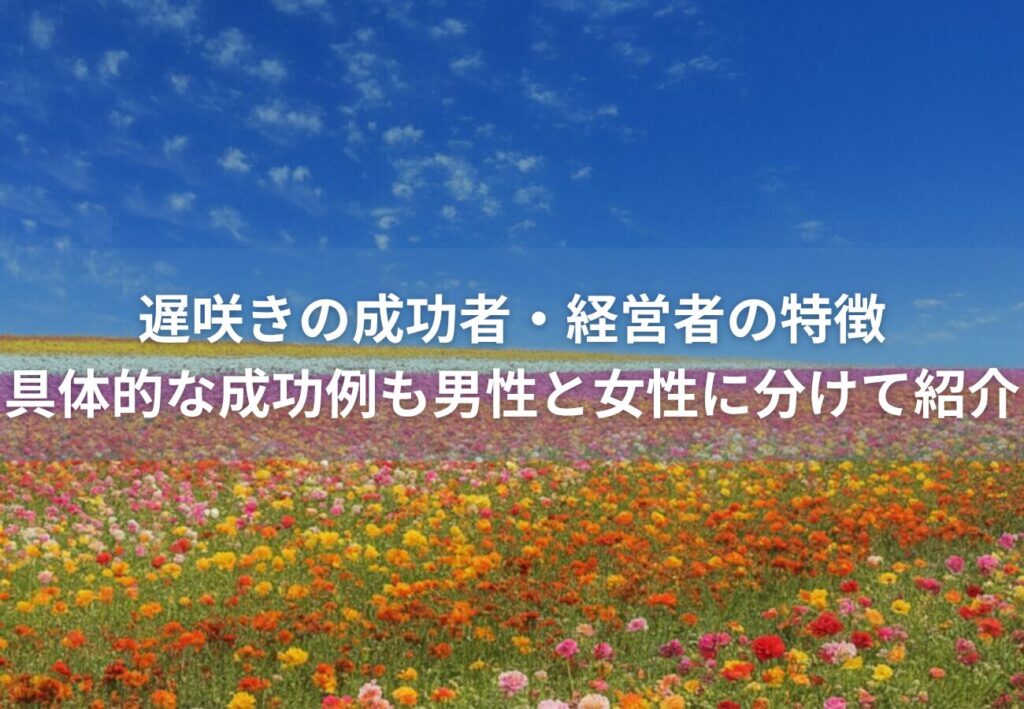 この記事では遅咲きの成功者・経営者の特徴を紹介します。具体的な成功例を男性と女性に分けて解説しますので、年齢性別問わず、遅咲きや大器晩成に興味のある方はぜひご覧ください。