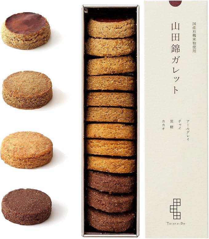 『グルテンフリー 米粉の焼き菓子 山田錦ガレット』は、有機山田錦の米粉を使った4種アソートのガレットを詰め合わせた缶入りクッキーです。乳・卵・小麦・白砂糖を使わず、アーモンドやてんさい糖などの素材で、米粉ならではのほろほろ食感に仕上げています。
